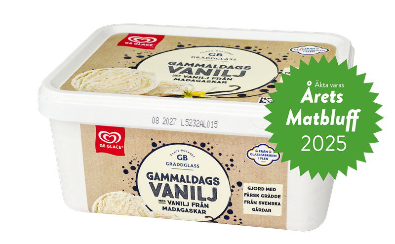 Gammaldags vanilj är en av GB:s klassiker, inslagen i papp och med ett innehåll som inte är helt olikt hemgjord glass. Exempelvis innehåller den grädde och äggula samt inga tillsatser. Förra året lanserade de glassen i en större plastlåda, med samma namn och design som originalet.